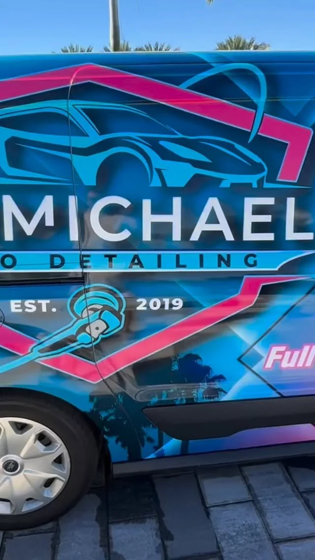 A colorful van with a vibrant wrap advertising Karmichael Auto Detailing, featuring the company logo, phone number, website, and social media icons.